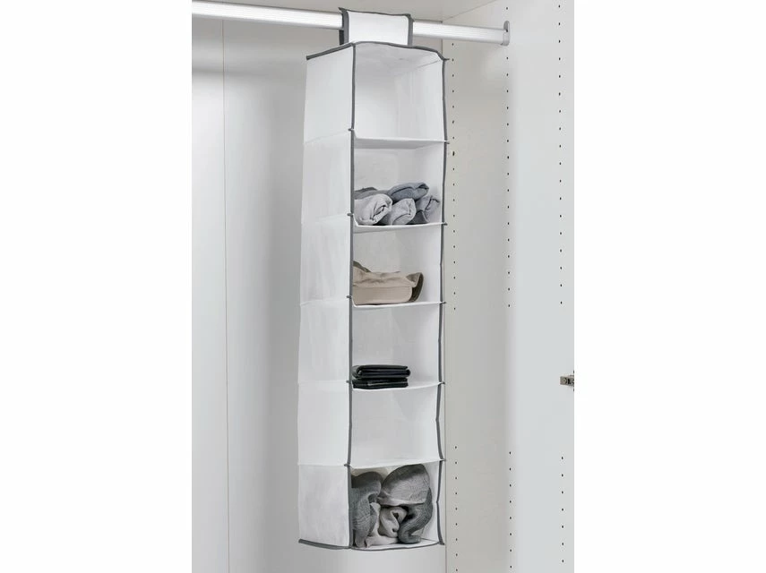 Das praktische Hängeregal “Bella Casa” aus reißfestem Gewebe bringt Ordnung uns System in jeden Kleiderschrank. Es hat 6 Etagen und misst 20x20x90 cm. Ohne Dekomaterial.