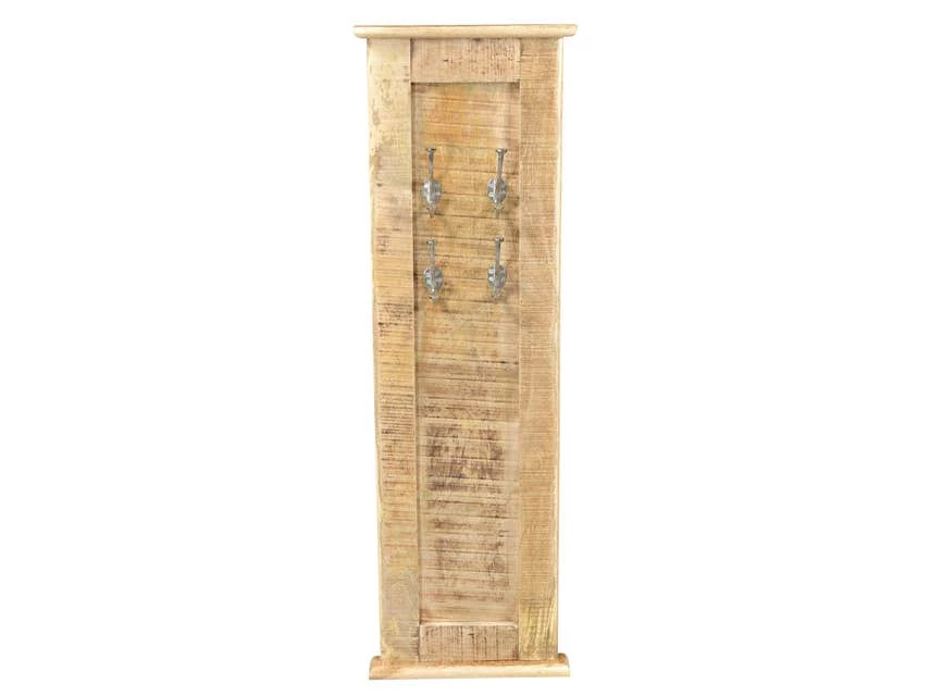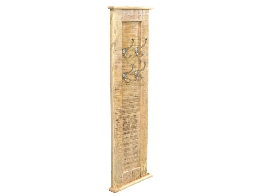 Dielenmöbel abseits von klassischem weiß und unaufregendem Design. Mit dieser Garderobe aus massivem Mangoholz holen Sie sich ein Design-Objekt mit dem gewissen Etwas ins Haus. Mangoholz besticht durch seine Individualität und seine besondere Struktur und macht so jedes Möbelstück zu einem unverkennbaren Unikat. Die natürliche Maserung und Struktur ist sichtbar und verleiht der Garderobe eine schicke Note. Der charakteristische goldene Farbton des Holzes verleiht dem Raum Wärme und harmoniert optimal mit den meisten Farben. Besonderes Highlight der Garderobe sind die silberfarbenen Haken. Die vier Haken bieten genug Platz für (Jacken etc), da sie sehr lang sind und man auch problemlos mehrere Jacken auf einen Hacken hängen kann. Für ein ansprechendes Ambiente im Haus sicherlich eine gute Wahl.