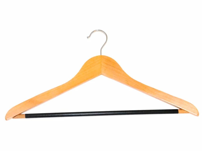 Sorgen Sie mit diesem hochwertigen Konfektionsbügel für ein knitterfreies Aufhängen Ihrer Kleidung und für mehr Ordnung in Ihrem Schrank! Der praktische Kleiderbügel besteht aus naturfarbigem Holz und ist mit einem rutschfesten Steg und einem vernickelten Haken versehen.