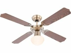 Hochwertige Materialien sind bei Champion meisterlich kombiniert und er punktet mit einer tollen Doppelfunktion: Das schicke Modell ist Deckenleuchte und Ventilator zugleich. Besonders raffiniert und dekorativ sind die wend- und beliebig einsetzbaren Rotorblätter in Eichenholzoptik sowie das Edelstahlgerüst mit feinen, altmessigfarbenen Details. Und natürlich macht Champion auch ordentlich viel frischen Wind, nämlich dank Links- und Rechtslauf kühlen im Sommer und wärmeren im Winter. Dazu verhelfen drei verschiedene Geschwindigkeitsstufen und eine Motorleistung bis 50 Watt, per Zugschalter ist das praktische 2-in-1-Modell einfach zu handhaben. Ob im Wohn- oder Schlafbereich, im Vorzimmer oder Büro, es sorgt für entspannte Stunden, eine individuelle Beleuchtung dank frei wählbarem Leuchtmittel und ein stets angenehmes Raumklima.