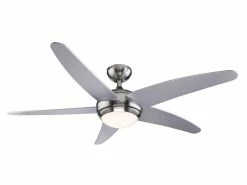 Holen Sie sich frische Luft und freundliches Licht in Ihre vier Wände! Denn das schicke 2-in-1-Modell Fabiola ist Deckenleuchte und Ventilator in einem. Die edle Optik mit eleganten Rotorblättern in Metallicsilber, verchromten und nickelmatten Metallelementen und halbugelförmigen Lampenschirm aus opalem Glas wirkt modern und lässt sich mit vielen aktuellen Einrichtungsstilen gut kombinieren. Ob im Wohnbereich oder im Büro, Fabiola ist ideal für größere Räume und sorgt im Sommer für frische, kühlere Luft und für wärmere im Winter. Dafür stehen drei Geschwindigkeitsstufen zur Verfügung und eine Motorleistung bis 55 Watt. Zur einfachen Steuerung liegt eine Fernbedienung bei und das passende E24-Leuchtmittel ist individuell wählbar. Die praktischen Doppelfunktionen sorgen für eine angenehmes Beleuchtung, ein positives Raumklima rund ums Jahr – und somit das optimale Wohlgefühl.