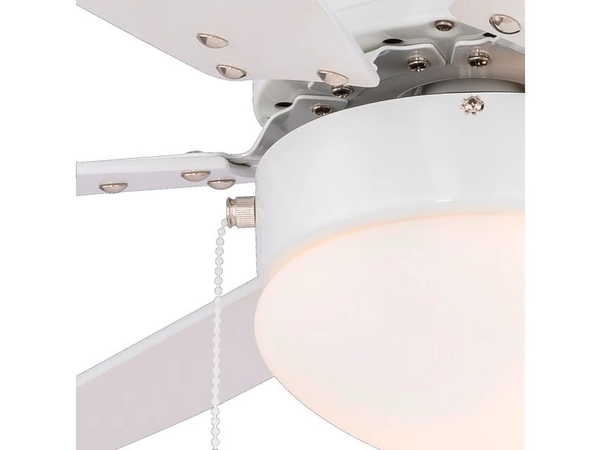 Mit Licht, Luft und tollem Design punktet Rivaldo, denn das schicke Modell ist Deckenleuchte und Ventilator in einem. Wohnlichen Charakter verströmt der Mix aus nickelmattem Metall, opalweißen Glasschirm und den formschönen Rotorblättern in Weiß, der zu vielen Wohnstilen hervorragend aussieht. Ob im Wohn-, Schlaf- oder Essbereich, im Homeoffice oder im Büro, überall dort spendet Rivaldo ausreichende Helligkeit und frische Raumluft – kühlere im Sommer und wärmere im Winter. Diese entstehen durch zwei verschiedene Drehrichungen, drei Geschwindigkeitsstufen und eine Motorleistung bis 50 Watt. Mit dem Zugschalter lässt sich die Leuchte einfach handhaben. Die praktische 2-in-1-Funktion bietet den optimalen Wohlfühlfaktor und sorgt für entspannte Stunden, eine ausgezeichnete Beleuchtung und ein angenehmes Raumklima.
