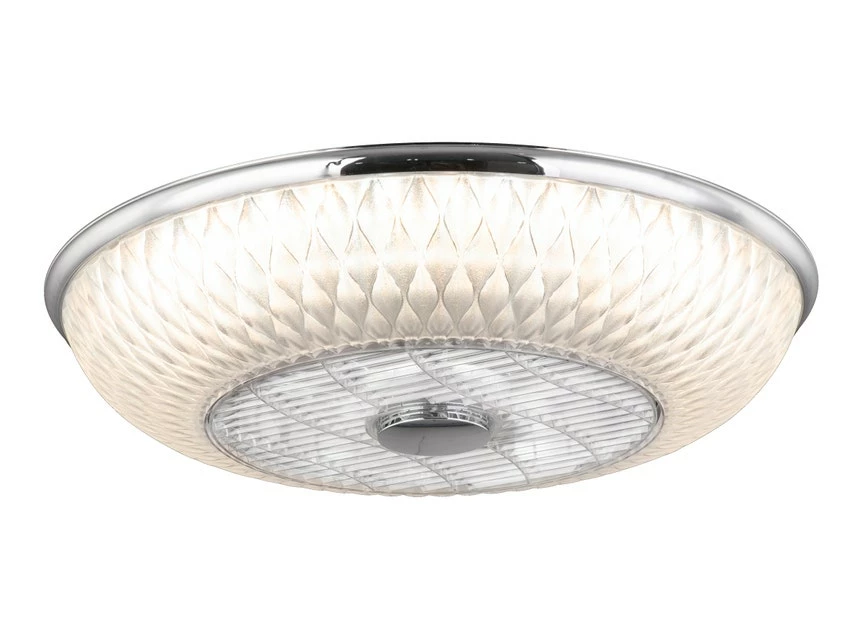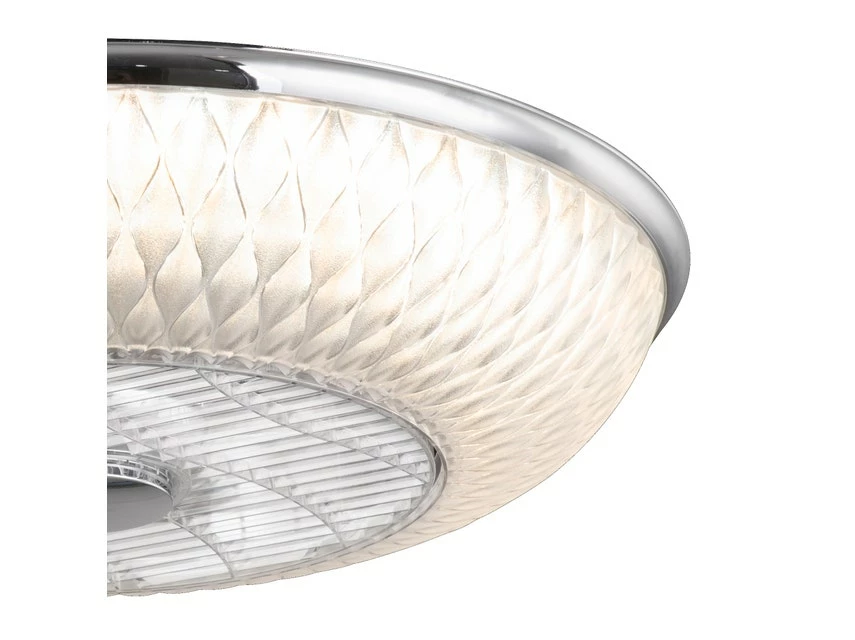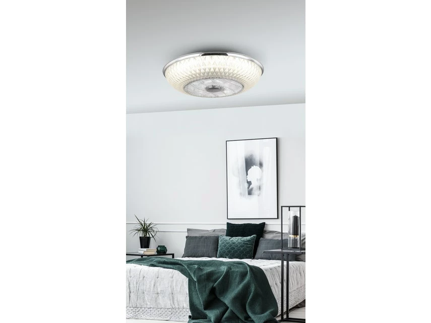 Mit Licht, Luft und einem wunderschönen Design glänzt Rosario, denn das elegante Modell ist Deckenleuchte und Ventilator in einem. Raffiniert gestaltet ist die Doppelfunktion nicht gleich erkennbar, doch durchdacht konzipiert. Hinter dem runden Lampenschirm aus verchromtem Metall und satiniertem Acryl mit effektvoller Struktur sind die Rotorflügel und ein energiesparendes 36-Watt-LED installiert. Rosario schenkt frische Raumluft und für die stets passende Lichtatmosphäre kann man die Helligkeit dimmen sowie die Farbtemperatur von gemütlichem Warm- bis zum sonnigen Tageslichtweiß verstellen. All das lässt sich einfach und bequem mit der beiliegenden Fernbedienung, die inklusive Batterien geliefert wird, steuern. Die tollen Extras garantieren den optimalen Wohlfühlfaktor und sorgen für entspannte Stunden, eine perfekt abgestimmte Beleuchtung und ein immer angenehmes Raumklima.
