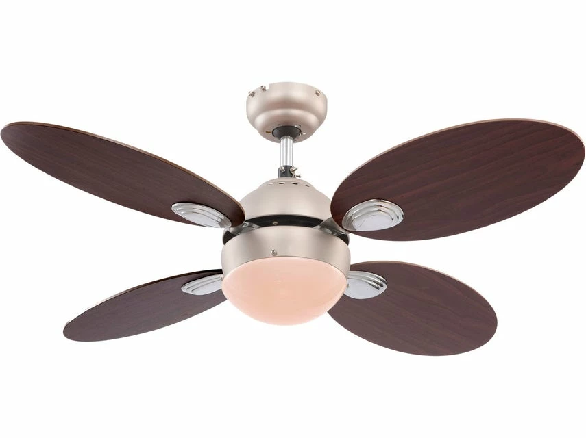 Wade bringt Licht, frischen Wind und schickes Design in Ihr Zuhause, denn das stylische Modell ist Deckenleuchte und Ventilator in einem. Die formschönen, gerundeten Rotoblätter bestehen aus robustem MDF und sind wendbar – auf der einen Seite begeistern sie mit Kirsch-, auf der anderen mit dunkelbrauner Walnussholzoptik sowie verchromten und nickelmatten Metallelementen. Mit dem Zugschalter mit Kette lassen sich drei Drehgeschwindigkeitsstufen einstellen und durch den Links- und Rechtslauf gibt es frische, kühlere Luft im Sommer und warme im Winter. Mit seinen praktischen 2-in1-Funktionen und dank frei wählbaren Leuchtmittel schafft Wade maßgeschneiderte Lichtverhältnisse uns ein ganzjährig angenehmes Raumklima mit hohem Wohlfühlfaktor.