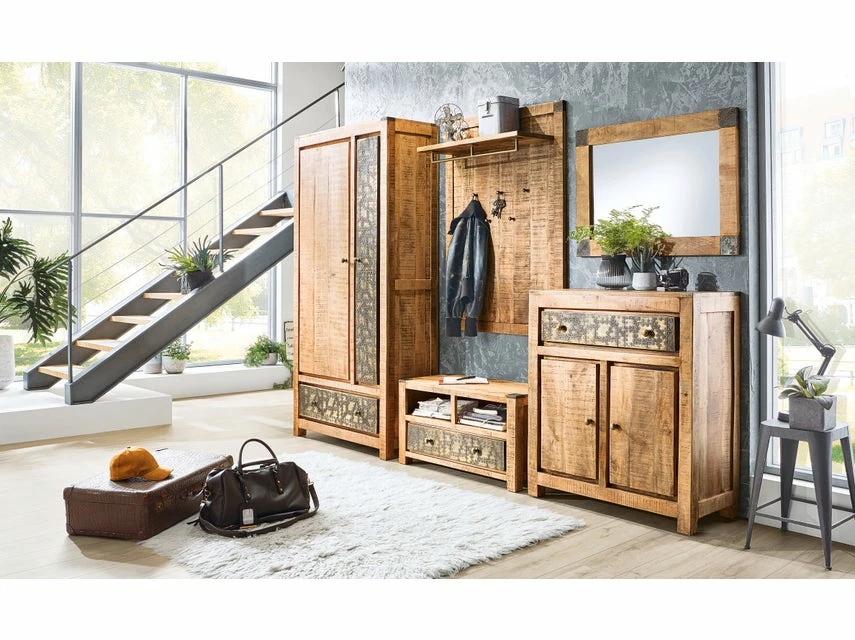 Mango-Holz massiv, gebürstet, mit Messingapplikationen, ca. B 90. H 125. T 30 cm,