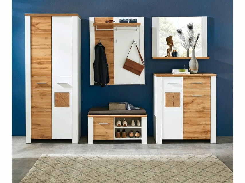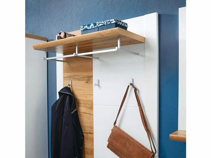 Mit dem Garderobenpaneel Vito Materio sind Sie in Ihrem Eingangsbereich perfekt ausgestattet. An den Garderobenhaken und der Kleiderstange finden Mäntel, Schals, Jacken und mehr Platz und die Hutablage oben eignet sich ideal zur Aufbewahrung von Kappen und Taschen. Mit dieser Wandgarderobe können Sie sich Tag für Tag an Ihrem aufgeräumten Vorzimmer erfreuen. Weitere Möbel aus der Serie finden Sie gleich hier im Onlineshop und in unseren Einrichtungshäusern.