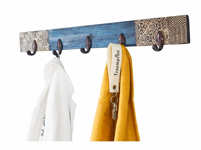 5 Haken, Mango/Akazie massiv, MDF mit Metallapplikationen, B 90. H 8. T 2 cm,