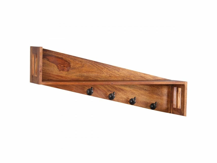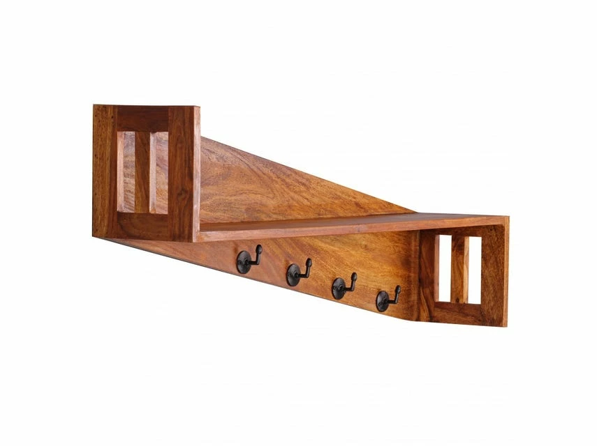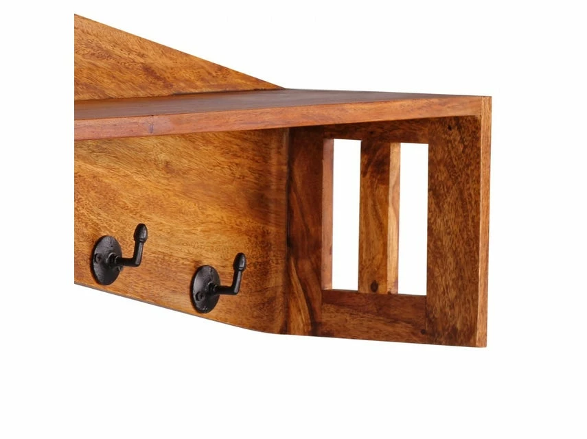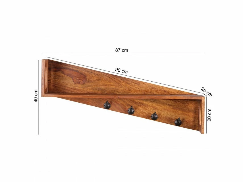 Wofür geeignet? Dieses Regal ist durch ihre 4 Kleiderhaken auch ideal als Flurgarderobe geeignet und dank der Auflagefläche auch als Wandablage nutzbar. FSC® zertifizierte Ware: Bei dem Material handelt es sich um FSC® zertifizierte Ware aus verantwortungsvollen Quellen. Es wird besonderen Wert auf die Nachhaltigkeit bei den verwendeten Materialien gelegt. Beim Kauf dieses Produktes unterstützen Sie somit das Bestehen der Wälder. Pflegehinweise: Die Oberfläche mit einem lauwarm angefeuchteten Baumwolltuch reinigen Keine Scheuermittel, scharfe Reinigungsmittel oder tropfnasse Tücher verwenden Keine weitere Behandlung der naturbelassenen Oberfläche (Ölen, Wachsen) notwendig Design Einzigartige Maserung Starke Auflagefläche Massivholz Abmessungen Breite: 87 cm Tiefe: 20 cm Gesamthöhe: 40 cm Abstand der Aufhängungen an der Rückseite: ca. 58 cm Weitere Abmessungen: Siehe Bilder Farbe Sheesham mit Klarlack überzogen Besonderheiten Gefertigt in Handarbeit Jedes Regal ein Unikat Vorrichtung zur Wandmontage an der Rückseite des Regals Material Massivholz Sheesham Da es sich um Handarbeit und um ein Naturprodukt handelt kann es zu Farbabweichungen oder Unebenheiten kommen Lieferumfang 1 Wandregal ohne Dekoration Material zur Wandmontage (2 Dübel + 2 Schrauben) Montage Lieferzustand: Montiert